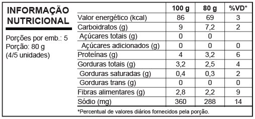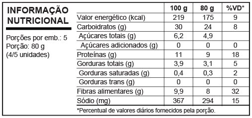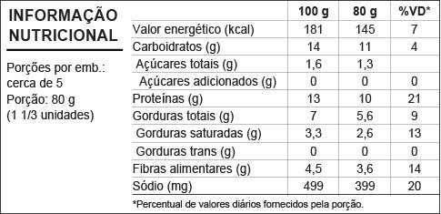 Água, proteína de soja, cenoura, farinha de trigo, óleo de palma, farinha de rosca, milho, cebola, ervilha, fécula de mandioca, sal, salsa, alho, condimento preparado sabor legumes e antioxidante extrato de alecrim.