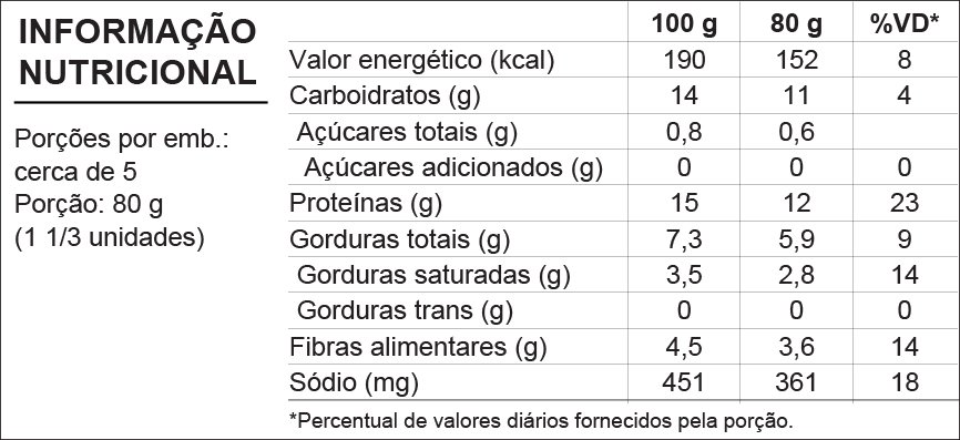 Água, proteína de soja, farinha de rosca, farinha de trigo enriquecida com ferro e ácido fólico, óleo de palma, cebola, fécula de mandioca, sal, salsa, alho, cebola, extrato de levedura, cacau, orégano, pimenta preta, páprica doce, manjericão, corante caramelo I e antioxidante extrato de alecrim.